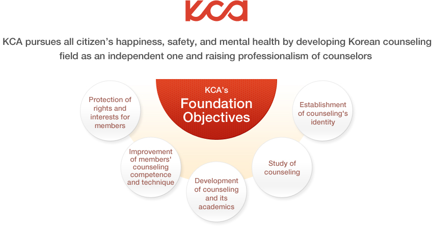 The Korean Counseling Association (KCA) was established with four sub-department academies (Society for University Counseling, Society for Group Counseling, Society for Career Counseling, and Society for Child and Adolescent Counseling) and 600 members on June 3rd, 2000. KCA's missions are independence, specialization, and popularization of Korean counseling. KCA aims to achieve three objectives to recognize all citizen's rights for their happiness, safety, and mental comfort and to correspond these rights and needs effectively and professionally: first, KCA develops counselling as an independent academic area with academic and practical evidences; second, KCA educates and trains professional counselors to possess qualification and ethical literacy; third, KCA constructs legal and institutional systems and economic, social, and cultural environment to provide services for happiness, safety, and mental comfort of all citizens. After being incorporated as the Corp. Korean Counseling Association on June, 2000, KCA consists of 34,000 members and 9,291 professional counselors (Level 1 are 1,944, and Level 2 are 7,347), and 14 sub-departments, 9 local departments, 390 institutional members, 234 education training centers, and 40 library members. In addition, KCA has been developed and grown as a representative of Korean counseling and mental health.
